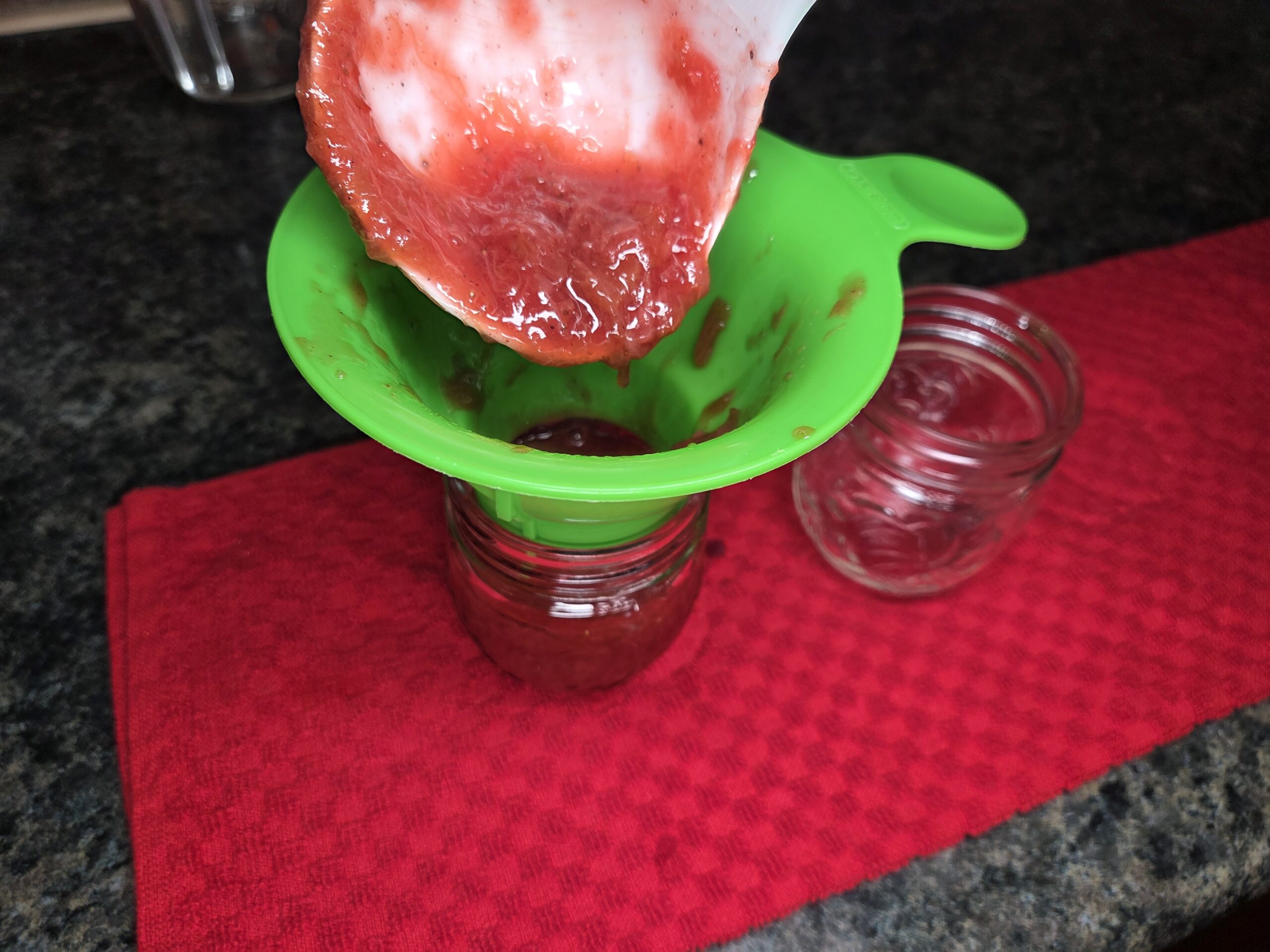 When your jam has finished cooking, it’s time to get those jars ready for the canner. Working with hot jars and hot jam, ladle the mixture in while leaving a neat ¼‑inch of headspace at the top.