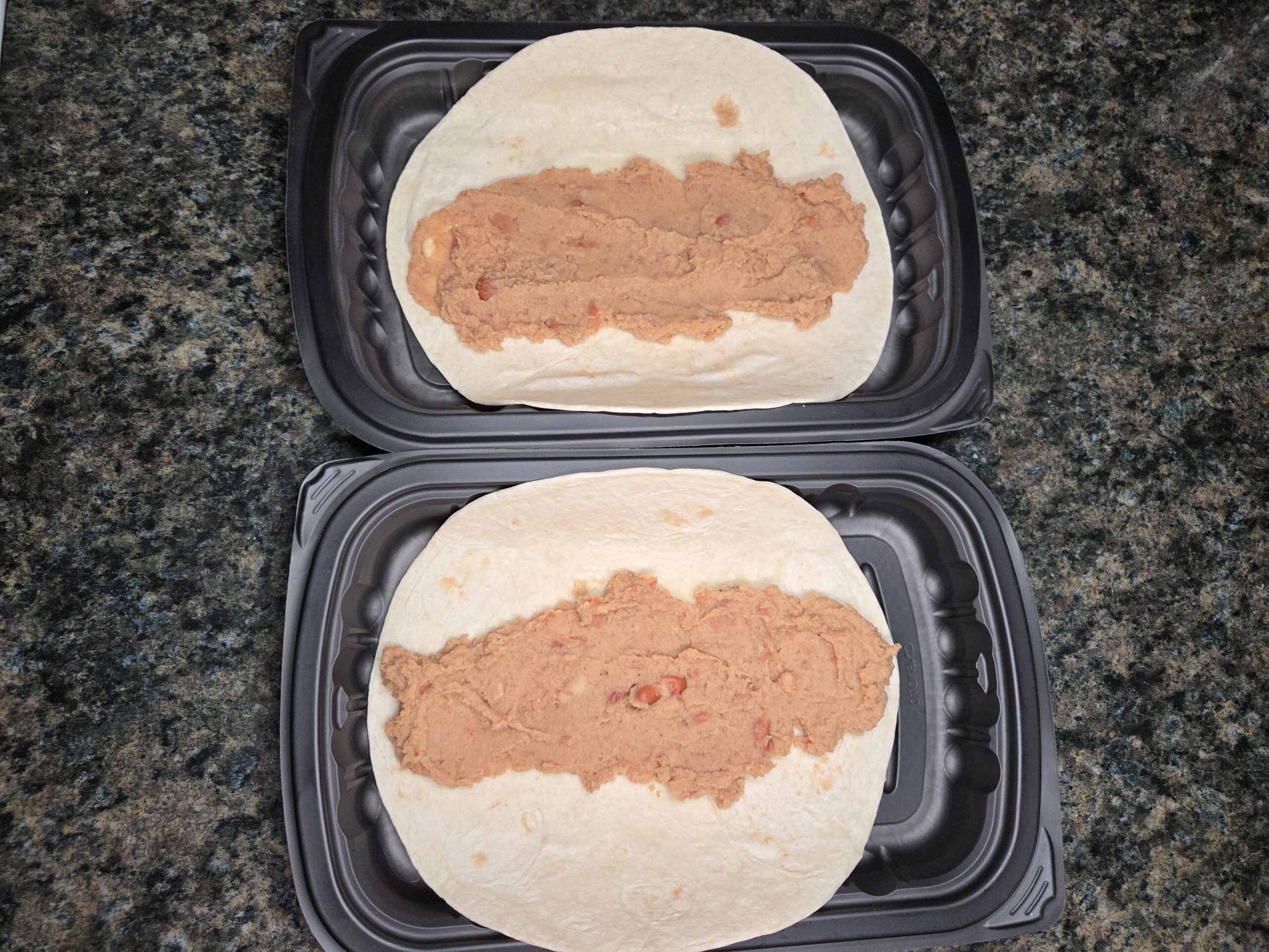 Warm one can of refried beans—either in the microwave or on the stovetop—until soft and spreadable. Lay out your flour tortillas and swipe a generous ribbon of those warm beans right down the center to create the classic Enchirito base.