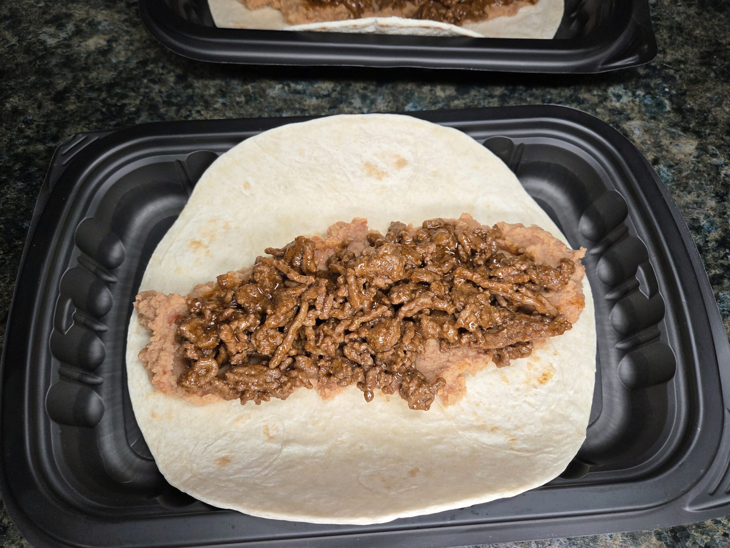Add a generous layer of seasoned taco meat on top of the refried beans.