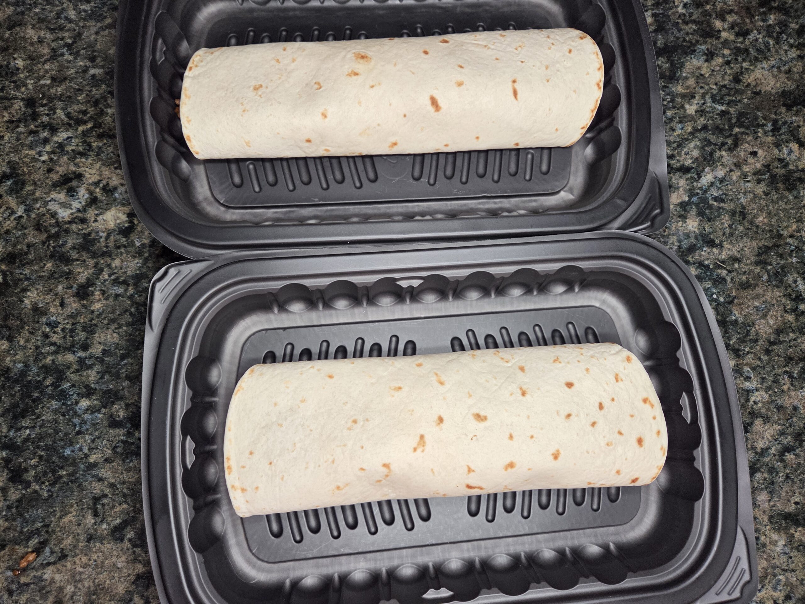 Roll each tortilla up snugly to hold the filling in place, then set it seam‑side down in a microwave‑safe dish so it stays neatly tucked as it heats.