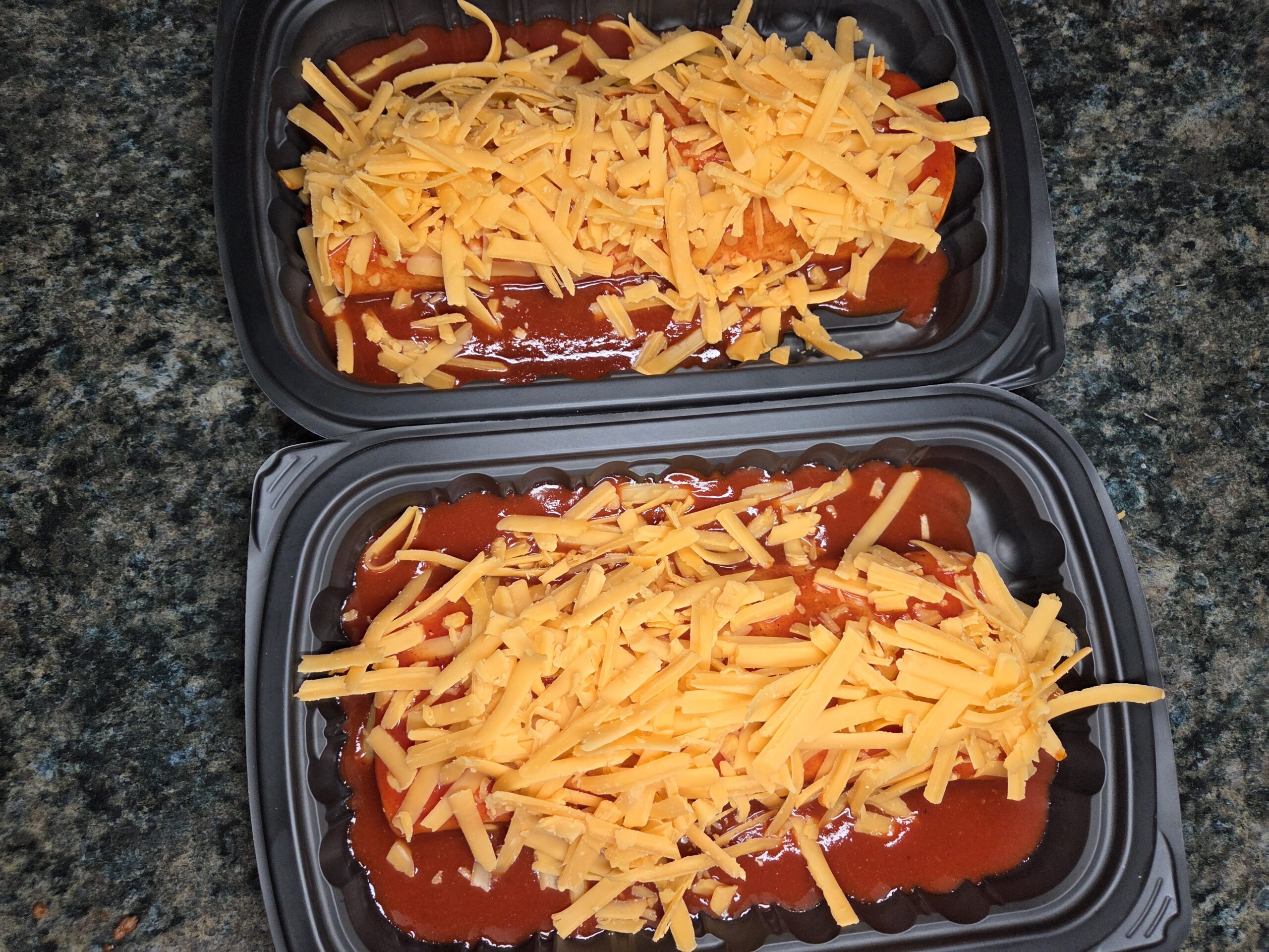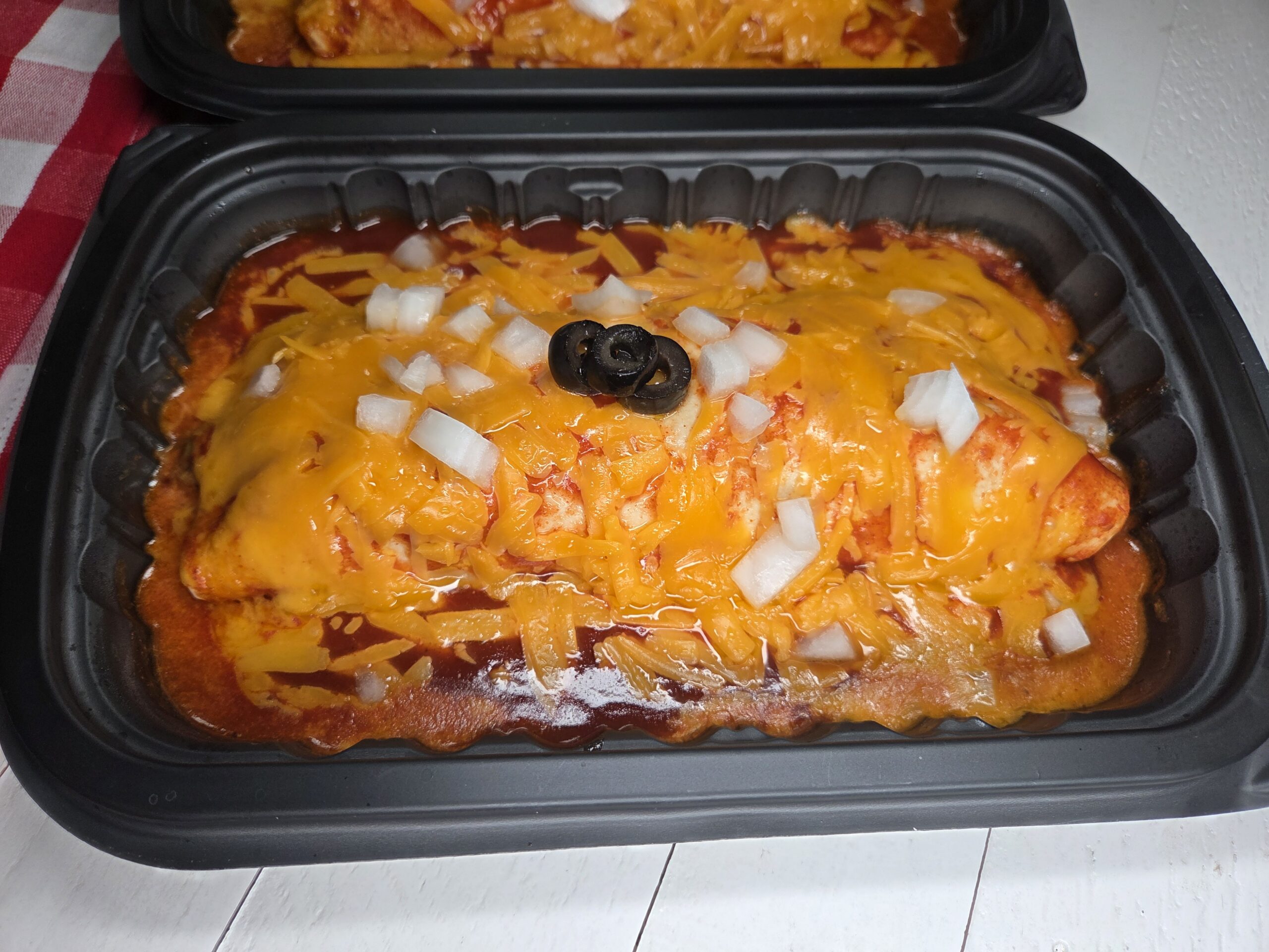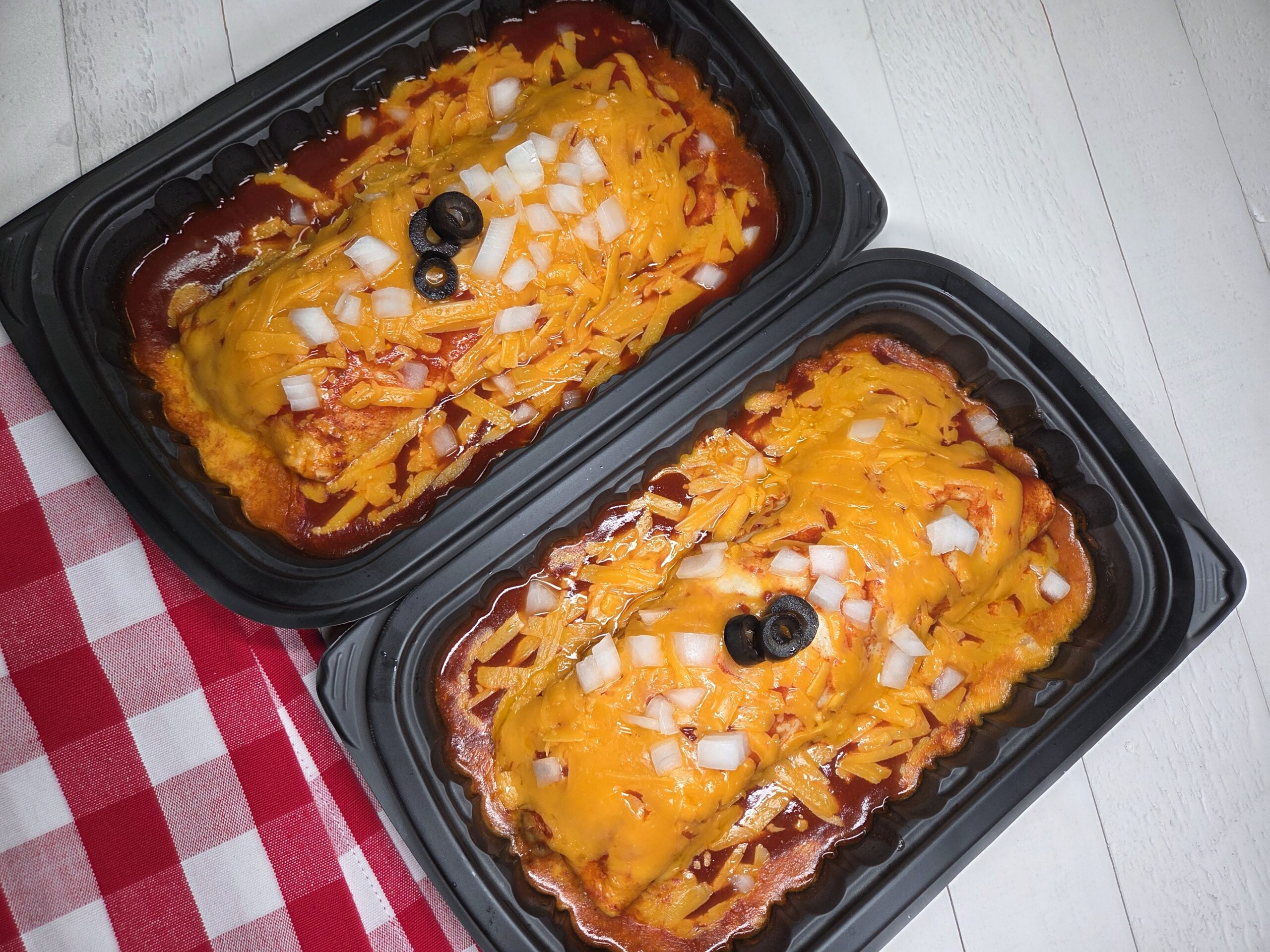 Pour about 1/3 to 1/2 cup of warm enchilada sauce over each Enchirito, then finish with a generous handful of shredded cheddar cheese. Microwave just until the cheese melts into a gooey blanket, then top with diced yellow onions and sliced olives for that classic throwback finish.