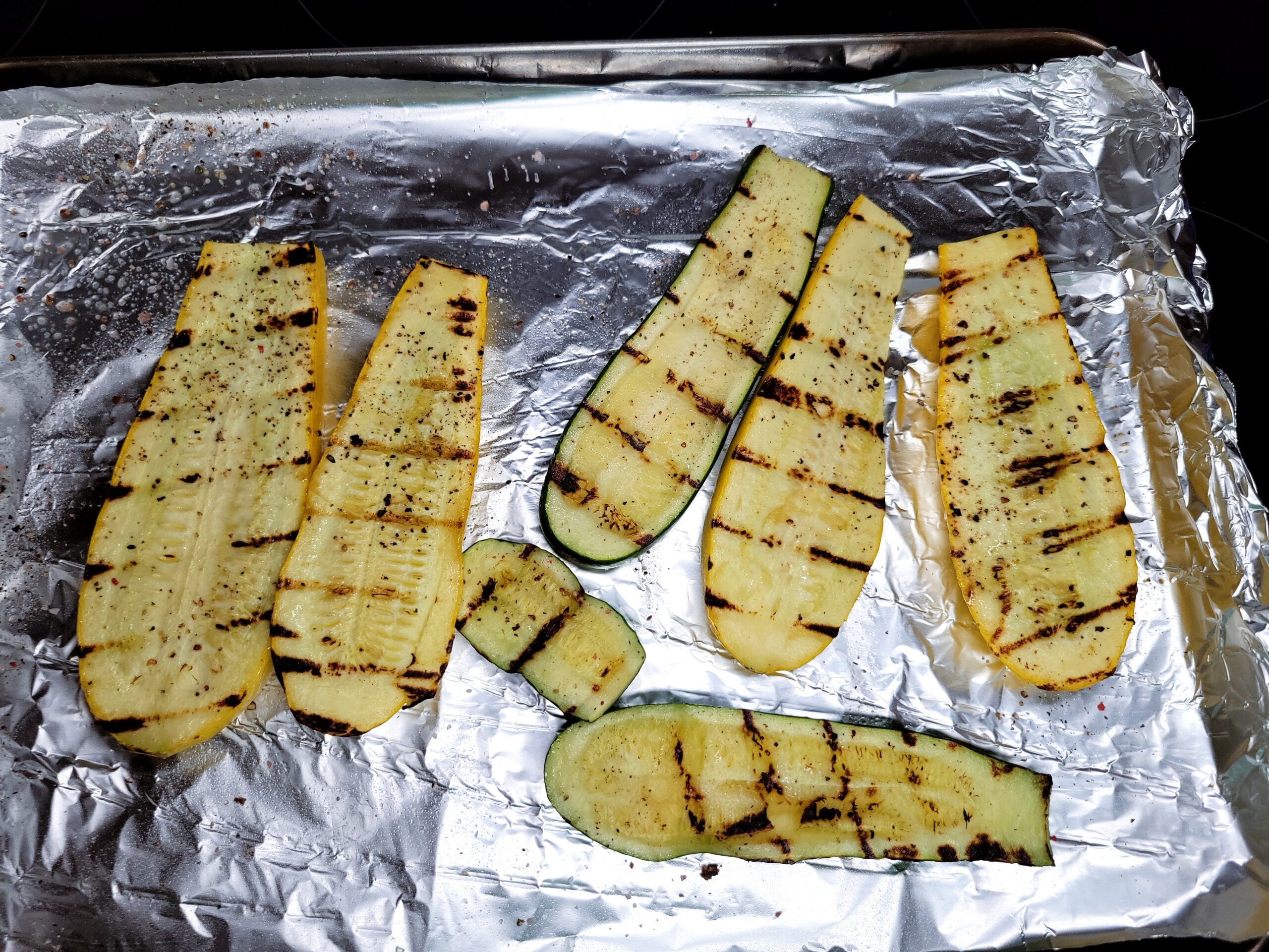 Preheat the grill or grill pan to 400-450 degrees. Slice the zucchini and yellow squash lengthwise. Lightly coat them with extra virgin olive oil and season with salt and pepper.