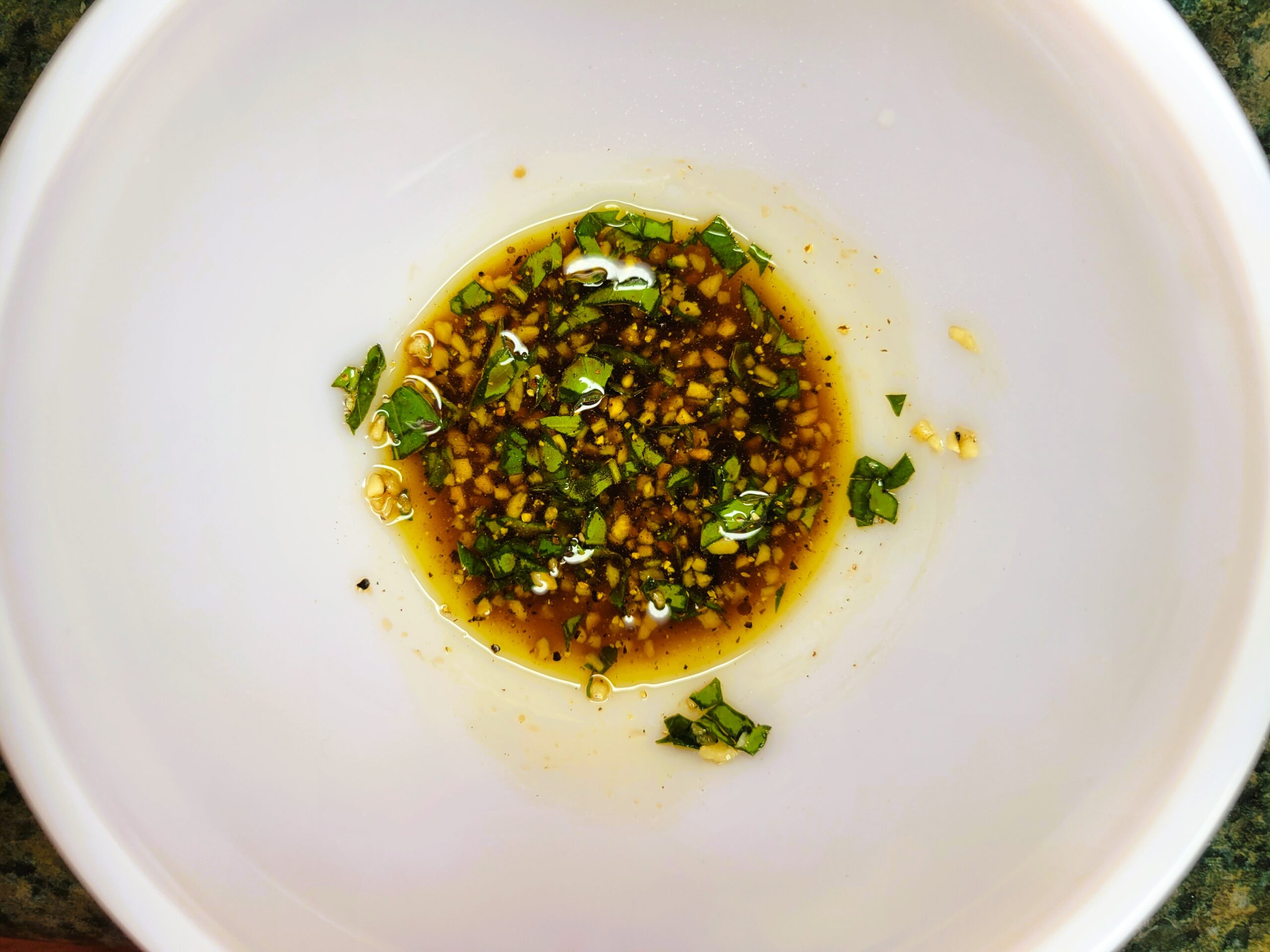 In a small bowl combine: 1 tablespoon of extra virgin olive oil, 2 tablespoons of balsamic vinegar, 1 clove of minced garlic and finely chopped basil leaves.