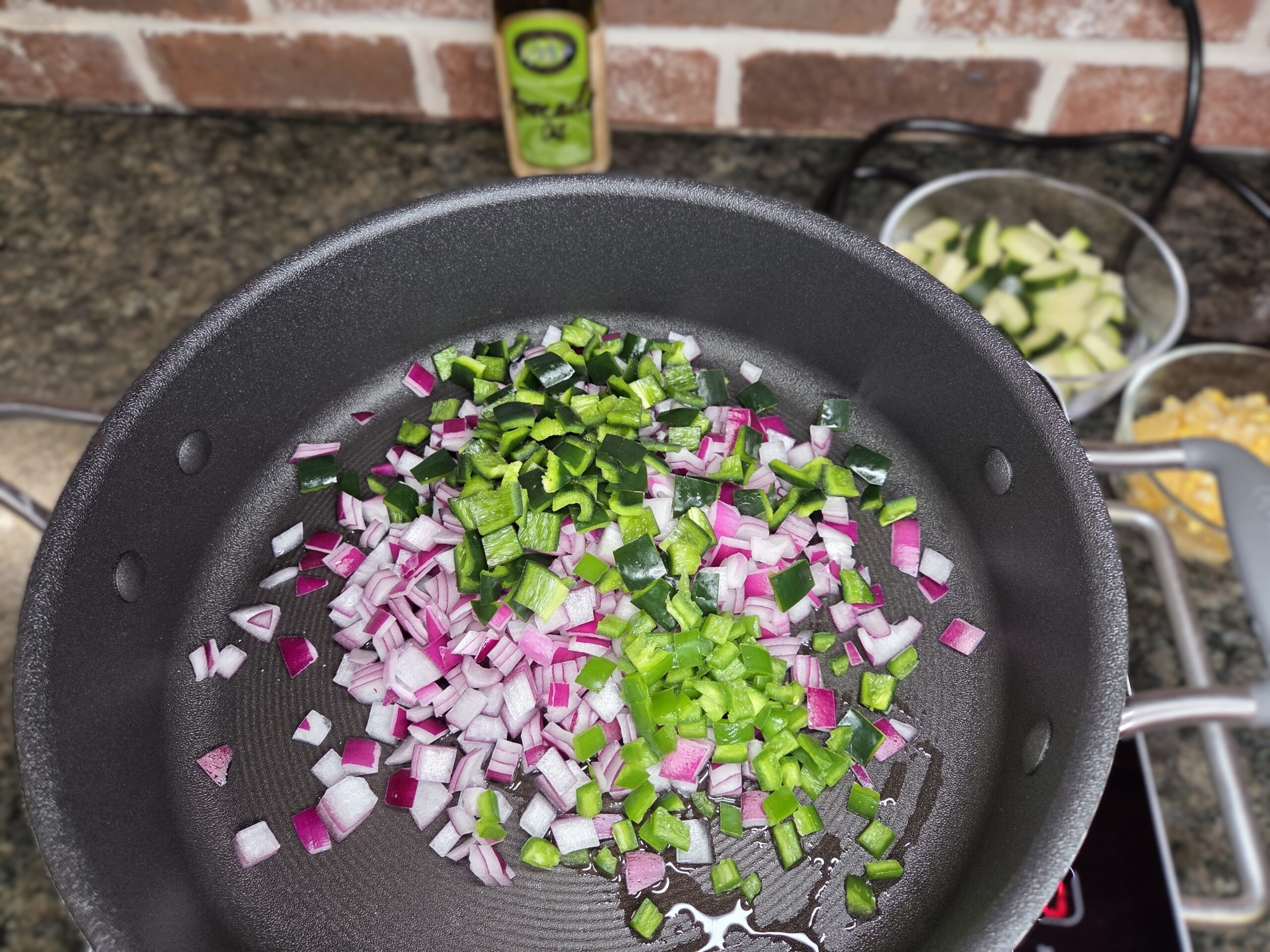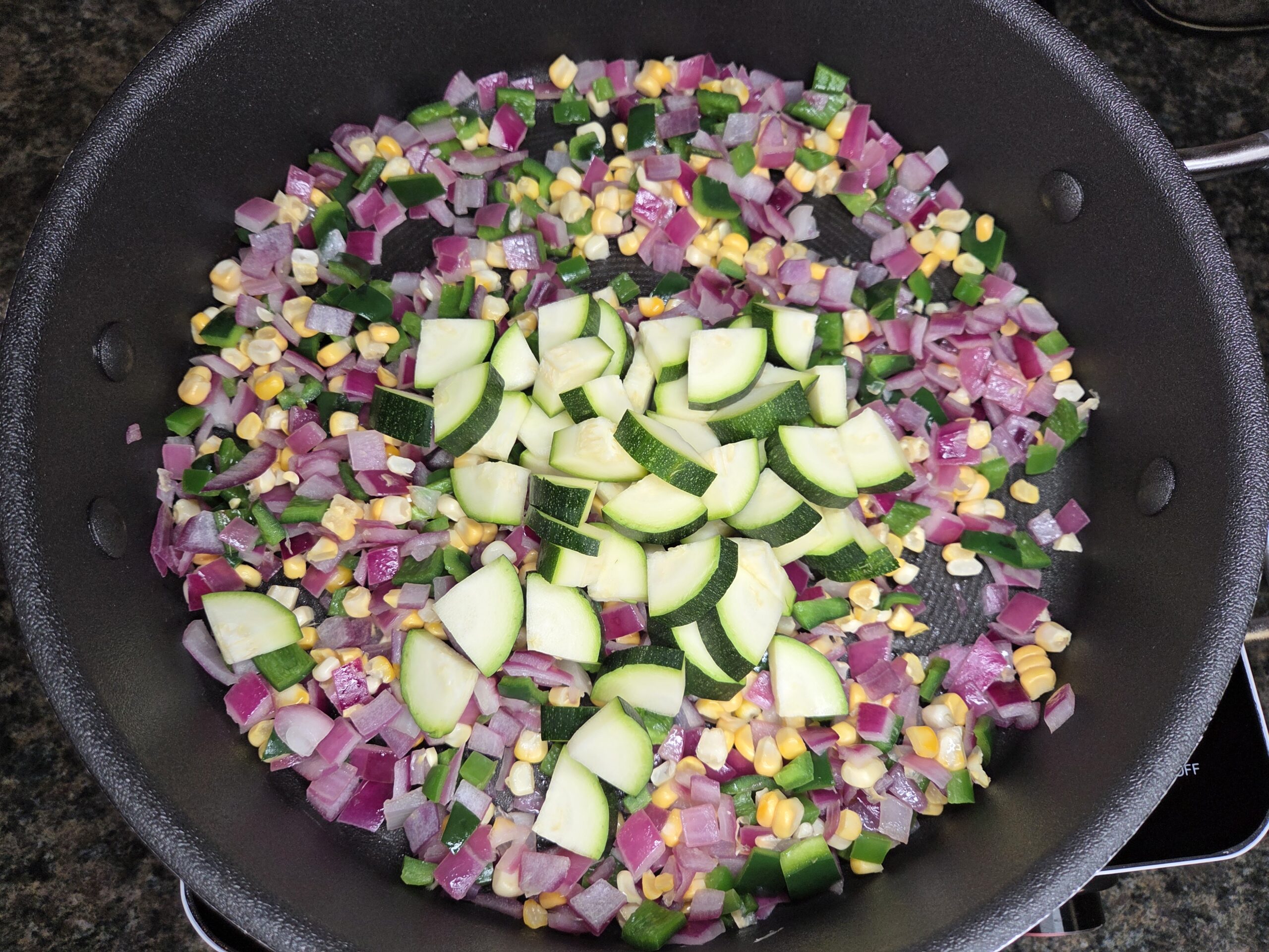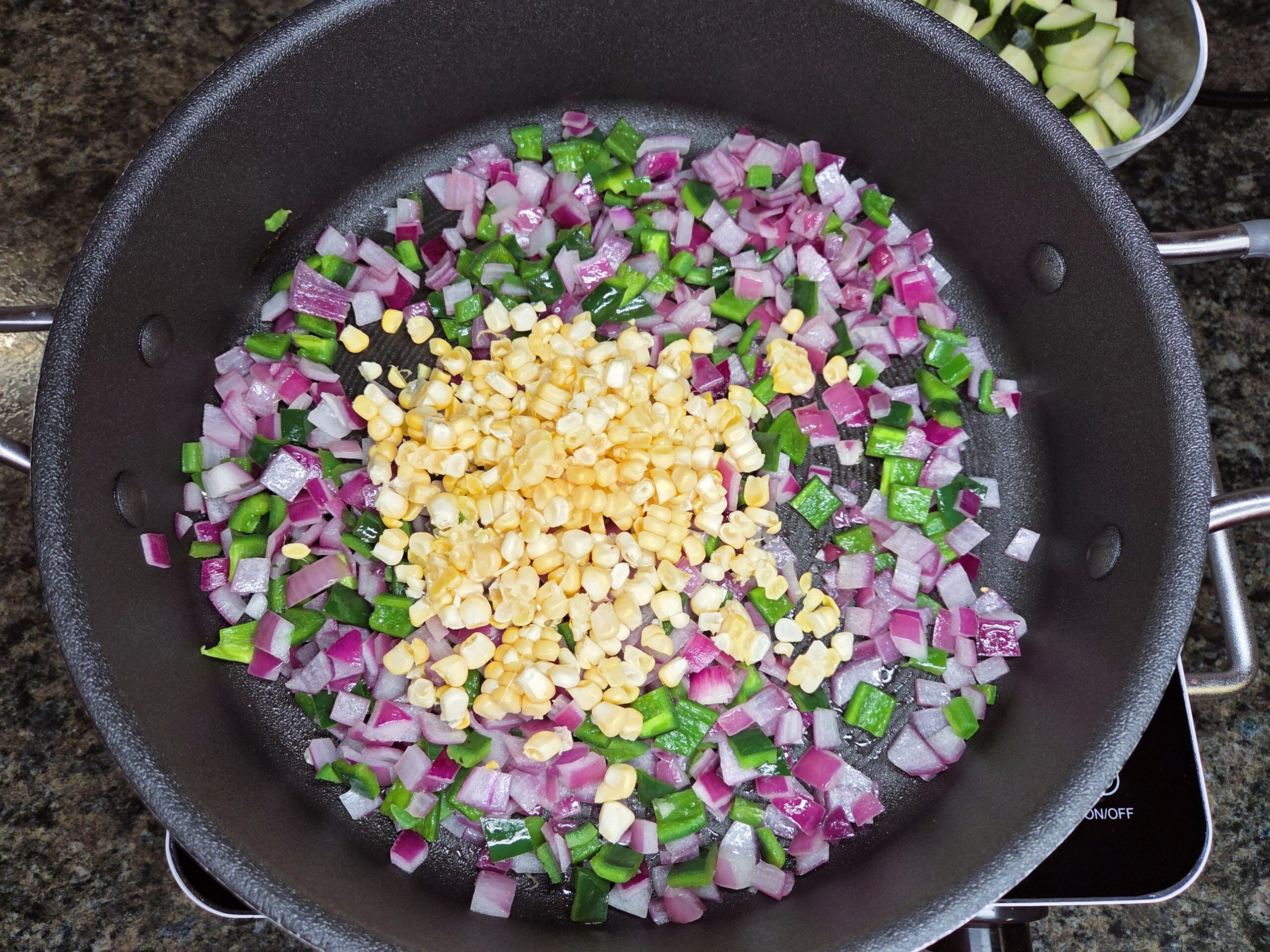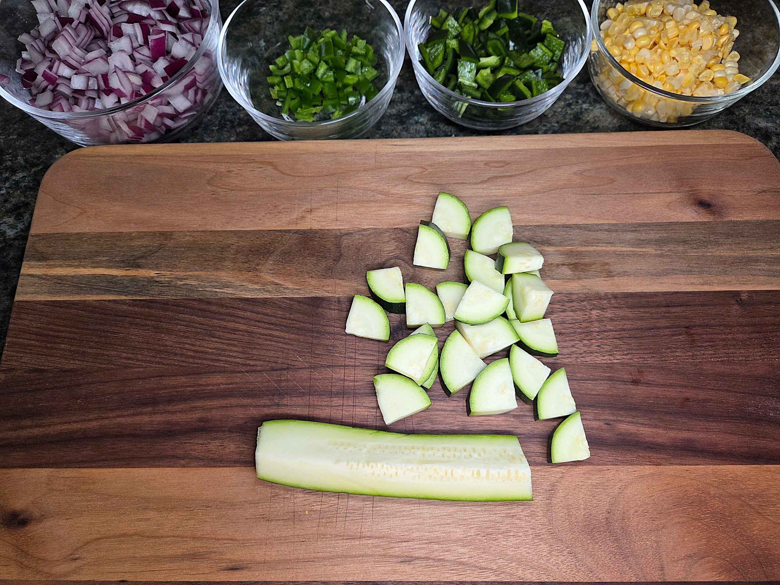Preheat the oven to 375°F. Prepare the vegetables. Cut the kernels off 1 ear of corn and dice 1 red onion. Stem, seed, and dice 1 poblano pepper and 1 jalapeño pepper; Anaheim or Hatch peppers can be substituted. Cut 1 medium zucchini into 1/4-to-1/2-inch pieces.