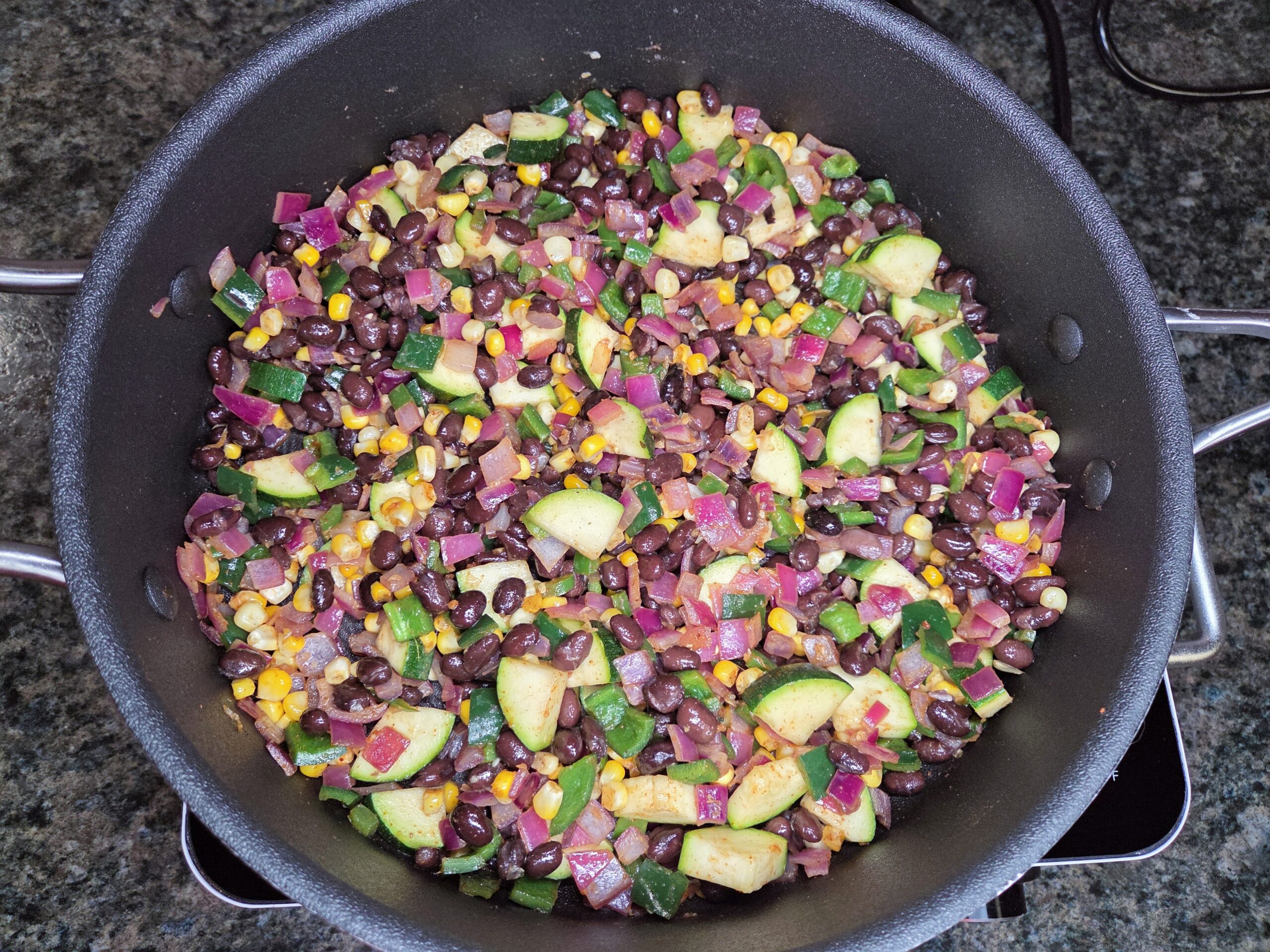 In a large skillet over medium heat, heat 1 tablespoon of oil. Add the red onion, poblano, and jalapeño. Cook, stirring occasionally, for 6–7 minutes, or until the vegetables are softened.