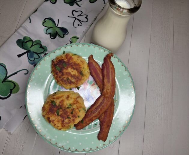 Mashed potato cakes with green onions, bacon, and butter, fried until golden brown, and served with more bacon!
