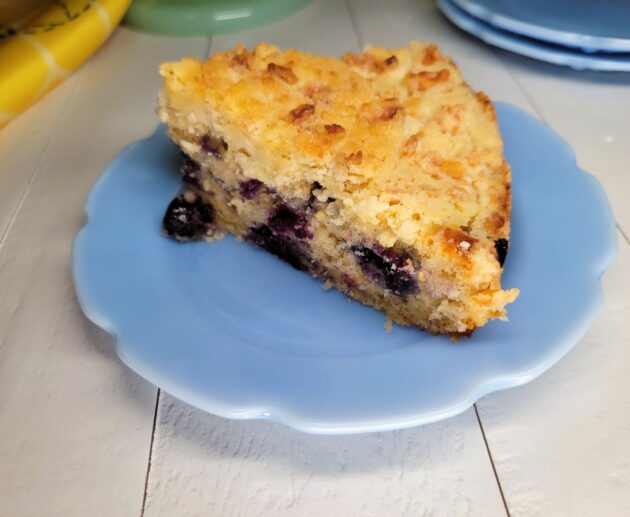 A scrumptious cake with a crumbly streusel topping, a hint of cinnamon, and bursts of blueberries.