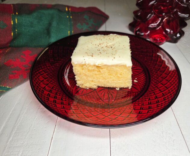 This moist eggnog cake with velvety cream cheese frosting and a sprinkle of nutmeg is pure holiday bliss in every bite.