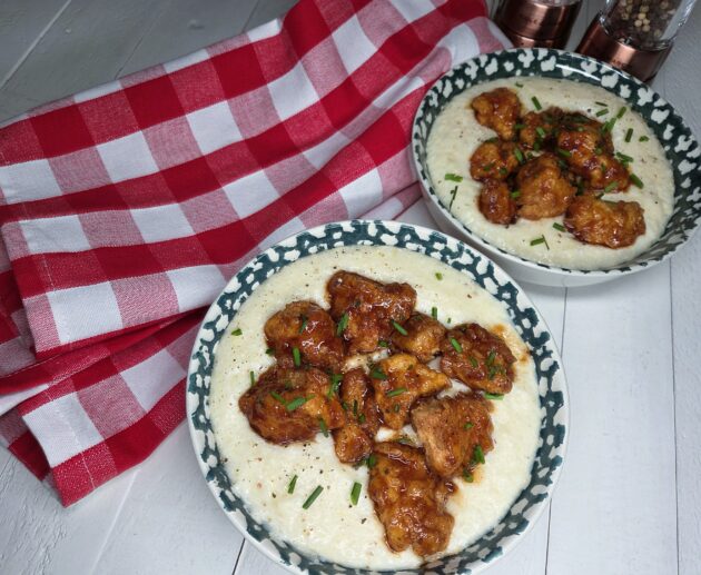 A creamy, delicious bowl of Gouda cheese grits paired with crispy fried chicken nuggets, tossed in tangy barbecue sauce, and finished with a sprinkle of