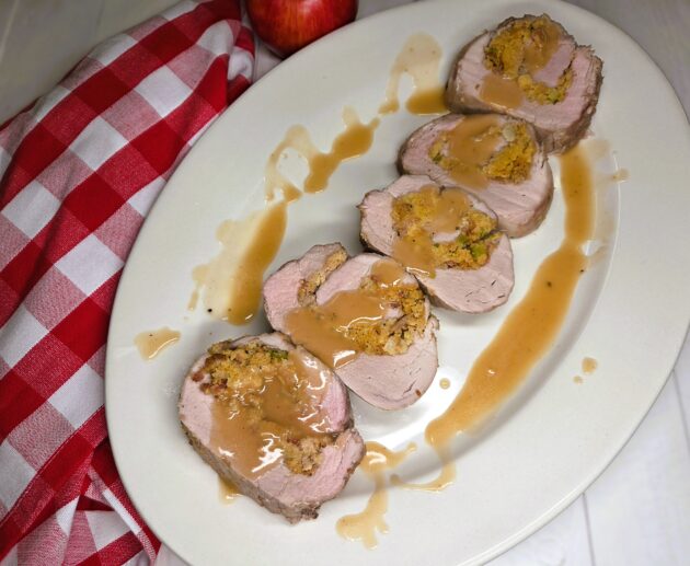 Tender pork loin, filled with savory cornbread stuffing and flavored with crispy bacon, thyme, and sage, topped with rich, flavorful apple cider gravy.