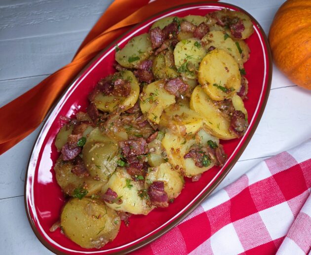 Warm, smoky, and tangy, this authentic German potato salad combines crispy bacon, zesty vinegar, fresh herbs, and tender potatoes, soaking up every delicious savory-sweet flavor.