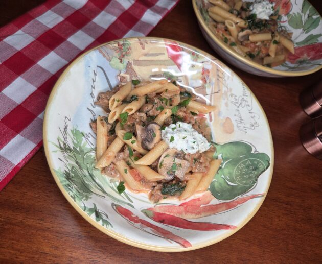 Italian sausage cooked in a rich tomato‑parmesan sauce, then tossed with kale and penne, and finished with a cloud of herbed ricotta.