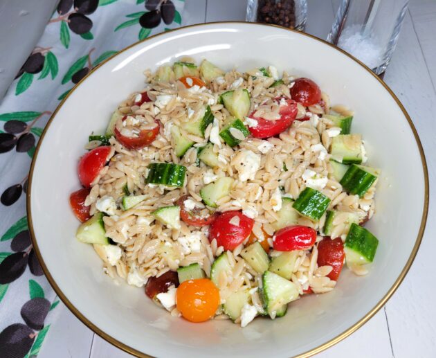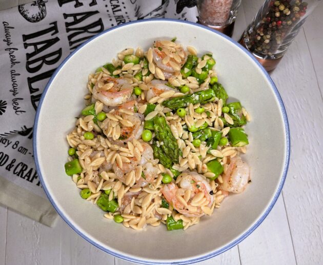 Shrimp, orzo, sweet peas, asparagus, parmesan and fresh lemon juice! Serve hot or cold, as a side salad or meal.