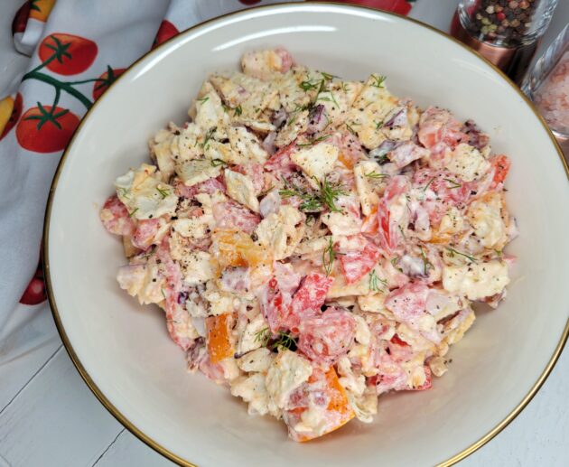 Fresh tomatoes, bacon, red onion with mayonnaise and fresh dill dressing.