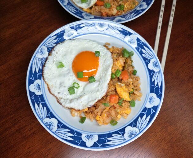 A bold, comforting bowl of kimchi fried rice topped with a crispy sunny‑side up egg.