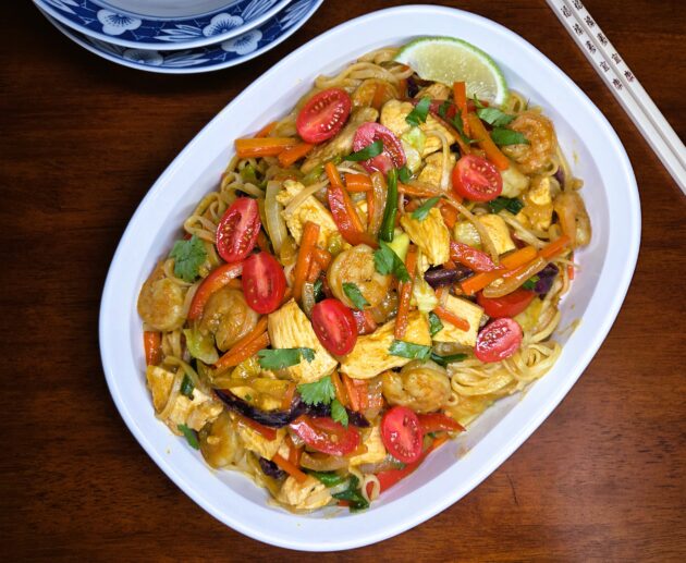 Easy Singapore Street Noodles with curry sauce, fresh veggies, shrimp, and chicken are bursting with flavor and loaded with vibrant color and texture.