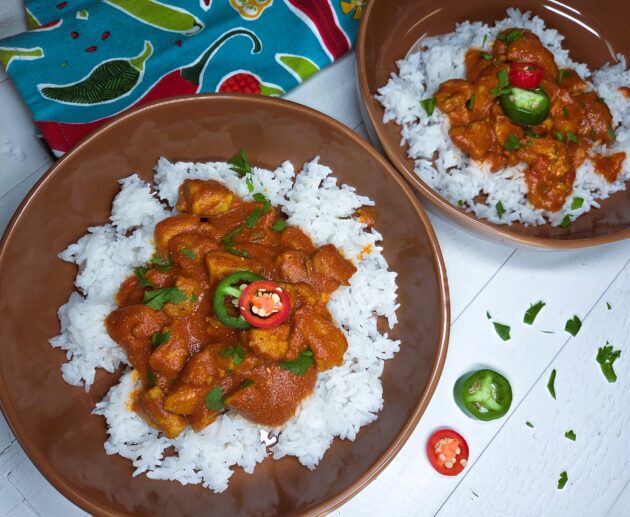 Seasoned chicken thighs are cooked in a creamy, curried tomato sauce made with yogurt and butter, resulting in a rich, luxurious flavor.