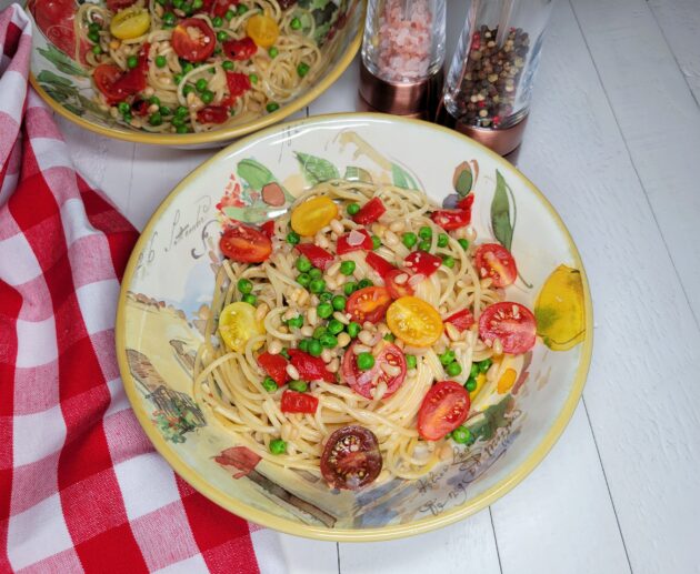 A mouthwatering pasta dish featuring easy creamy parmesan alfredo sauce, juicy tomatoes, roasted red peppers, sautéed shallots, fragrant garlic, and tender peas.